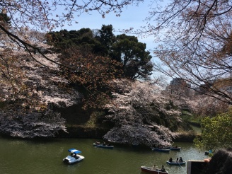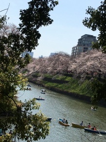 お堀沿いを歩いたり、ボートに乗って水面に浮かぶ桜を間近に楽しむ事もできます。